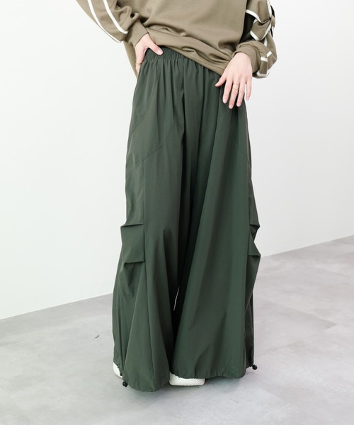 軽やかでモードな抜け感を演出する、シルエット自在のバルーンパンツ。【Material】薄手のポリエステルタフタ素材を使用。シワになりにくく、デイリーからアウトドアまで幅広く対応。さらっとしたドライタッチで快適な穿き心地で、シーズンレスで活躍します。【Design】丸みのあるバルーンシルエットが特徴的なデザインパンツ。裾にはドローストリングを配し、シルエットをバルーンにもストレートにもアレンジ可能。立体感のあるフォルムがトレンド感を引き立て、シンプルながら存在感のある1本です。【Size】ウエストは総ゴム仕様でリラックスしたフィット感。ゆとりのあるワイドシルエットながら軽やかな素材感で重たく見えず、体型を選ばずに着用できます。 【Styling Point】カジュアルなスウェットやTシャツと合わせてアクティブに、ブラウスやシャツを合わせれば抜け感のあるモードスタイルにもマッチ。スニーカーでラフに、ヒールで大人っぽくと合わせるアイテム次第で印象が変わる万能パンツです。 ........................【商品特性】透け感:なし裏地:なし伸縮性:ややあり光沢感:なし生地の厚さ:薄手........................___________________________★商品のお気に入り登録 完売カラーの再入荷通知や、ラスト1点の通知、セールの通知も受け取ることができます。是非ブランドの”お気に入り登録”もご一緒にお願い致します!!! ※画像の商品は光の反射や角度により、実物と色味が異なる場合がございます。 また、表示のサイズ感と実物は若干異なる場合もございますので、予めご了承ください。 ※着用、お取り扱いの際は、商品についている品質表示とアテンションタグを必ずご確認ください。-DOLLUPOOPS | ドールアップウップス-【Add a little essence】ライフスタイルの多様化が進む現代変わり続ける今をとらえ、自分らしい感性を大切にする女性に向けて" より美しく" 毎日を" 彩る" ワードローブを。日常に調和しつつ、" 普通 " に少しだけエッセンスをたして、他にない特別な一品を提案します。-Instagram-公式インスタグラム【dollupoops.tevalt_official】※商品のサイズ感やご質問は【dollupoops.tevalt_official】のインスタアカウントDMにて承っております。お気軽にご相談くださいませ。
