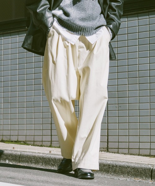 シルエットで取り入れるトレンド感ーーー■デザイントレンド感のあるボリュームが魅力のチノパンツが登場。樽のように膝周りでカーブするバレル/コクーンシルエットで仕立てています。2タックデザインを採用することで立体的なラインが叶い、抜け感のある雰囲気を演出します。ウエストサイドにはゴムを内蔵させているので、着用時のフィット感が高まります。■素材丈夫でしなやかなコットン100%素材を使用。綾織りのチノ生地で仕立てることで、より丈夫で耐久性の高い一本に。また、程よい厚みのチノ生地にすることでオールシーズン使って頂けます。======■参考サイズM:~175cmL:175cm~======ーーー
