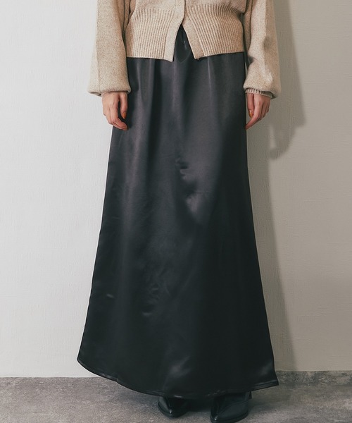 サテンマーメイドロングスカート ほどよい艶感が美しい、サテンマーメイドスカート。 落ちすぎないサテン生地を使用することで、身体のラインを拾いにくく、上品さと着やすさの両方を叶えました。 裾に向かってゆるやかに広がるシルエットが、歩くたびにふわっと揺れて女性らしいムードを演出。 ニットやスウェットなど、季節問わずどんなトップスとも相性抜群です。 ブラウン・ブラック・シャンパンの大人カラー展開で、カジュアルにもきれいめにも使える万能アイテム。 ブーツ合わせで秋冬らしいスタイリングも決まります。 ■商品のディテール ※透け感:なし ※光沢感:あり ※伸縮性:あり ※裏地:なし ※ウエストゴム:あり ■商品の色味、サイズについてのご注意 ※本製品は生産過程におきまして色味、サイズ感等若干の誤差が出る場合がございます。予めご了承くださいませ。 ※屋外での撮影画像は、光の当たり具合で色味が異なって見える場合があります。商品の色味は、スタジオでの詳細画像をご参照ください。 ※光の当たり具合、ライティング等によりモデル着用画像と実際の色味が異なって見える場合があります。 ※パソコンの環境によりお色の見え方に違いがある場合がございます。 ■インフォメーション 【商品のお気に入り登録】 再入荷通知やラスト1点の通知、お得な情報を受け取ることができます。 ぜひご登録ください。