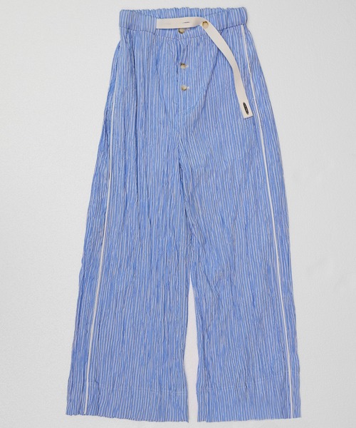 ■FABRICしわ加工を施した表情豊かな生地が、動くたびにニュアンスをプラス。■DESIGNパジャマディテールのイージーパンツは、ぐるりゴム仕様でストレスフリーな穿き心地を実現。ウエストには調節可能なベルトをあしらい、機能性だけでなくデザインポイントとしても映える仕上がりです。新鮮なグリーンストライプや爽やかなブルー、ジャケットとリンクする柄展開で、セットアップスタイルも楽しめます。単品でTシャツやランジェリーライクなトップスと合わせれば、抜け感のある春コーデに。ジャケットとのレイヤードで、今季らしいモードリラックスを完成させて。※商品画像はサンプルの為、色味やサイズ、素材の混率等の仕様に変更がある場合がございます。予めご了承ください。※カラーに関しまして…商品画像(モデル着用ではない画像)が商品に近いお色味です。予めご了承ください。※断ち切りデザイン(切りっぱなし仕様)の商品の場合、ご着用いただくにつれ、ほつれがみられる可能性がございます。そちらのデザインも含め、風合いをお楽しみください。【MAISON SPECIAL/メゾンスペシャル】SPECIAL IS YOUR STANDARD“ハイファッションとハイファクトリー”相反するものを掛け合わせて融合させることにより、新しい価値のファッション“CRAFT FASHION”を生み出していきます。・商品のお気に入り登録再入荷、残り1点などの通知を受け取ることが出来ます。・ブランドのお気に入り登録新商品や再入荷、ショップのおすすめトピックスなど、いち早くブランドのお得な情報を受け取ることができます。