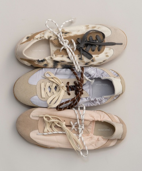 ■FABRIC ブルー:サテン×スウェード調合成皮革。ピンク:格子柄が特徴のリップストップナイロン×スウェード調合成皮革。 オフホワイト:アニマル柄プリントのキャンバス生地×スウェード調合成皮革。 ■DESIGN ギャザーや全体的なクタッとしたシルエットが新鮮なスニーカーです。 トレンドの薄底ローテクスニーカーの流れは、まるでバレエシューズのようなシルエットへ進化。 甘さを取り入れたディティール使いやカラーリングが、今季らしいムードのある仕上がりに。 ダブルリボンの仕様は2wayで楽しめるように、シンプルなシングル用の紐も付属します。 スニーカーのバリエーションにぜひ取り入れたい一足。 ※商品画像はサンプルの為、色味やサイズ、素材の混率等の仕様に変更がある場合がございます。予めご了承ください。 ※カラーに関しまして…商品画像(モデル着用ではない画像)が商品に近いお色味です。予めご了承ください。 ※断ち切りデザイン(切りっぱなし仕様)の商品の場合、ご着用いただくにつれ、ほつれがみられる可能性がございます。そちらのデザインも含め、風合いをお楽しみください。 【MAISON SPECIAL/メゾンスペシャル】 SPECIAL IS YOUR STANDARD “ハイファッションとハイファクトリー” 相反するものを掛け合わせて融合させることにより、新しい価値のファッション“CRAFT FASHION”を生み出していきます。 ・商品のお気に入り登録 再入荷、残り1点などの通知を受け取ることが出来ます。 ・ブランドのお気に入り登録 新商品や再入荷、ショップのおすすめトピックスなど、いち早くブランドのお得な情報を受け取ることができます。
