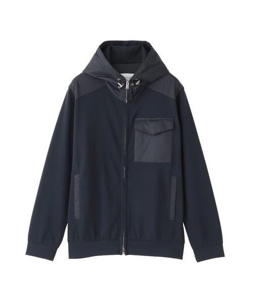 布帛とニットのコンビネーション使いがアクセントになったフーデッドパーカー【デザイン】布帛とジャージーとのハイブリッドジップパーカー。フードに保形芯を入れ、ファスナー止まり位置をフード側まで延長する事により、首廻りの収まりが良く、スッキリとたシャープな印象に仕上げています。コンフォートな着心地とモダンなスタイルを両立したデザインです。【素材】ジャージ素材:ピン仮撚りの針抜きジャージ素材。(一度引き揃え三子糸にした後に仮撚りを行い表面の風合いに変化を付けたジャージ素材)。程良い肉感でソフトな風合いが特徴。布帛素材:13Dナイロンのマイクロリップストップ素材。目付:32gの超軽量素材で、極細ナイロン糸を高密度で織り上げた洗練されたしなやかな風合いが特徴。【機能性】ウォッシャブルbritecアクテビティとシンプリシティを取り入れた従来のセットアップに捕らわれない、新感覚ビジネススタイルの提案。おすすめ着用期間:春/秋/冬※サイズについては、仕様書のサイズを記載しており、多少の誤差が出る場合がございます。※この商品はサンプルでの撮影を行っています。実際の商品とイメージ、仕様が異なる場合がございます。