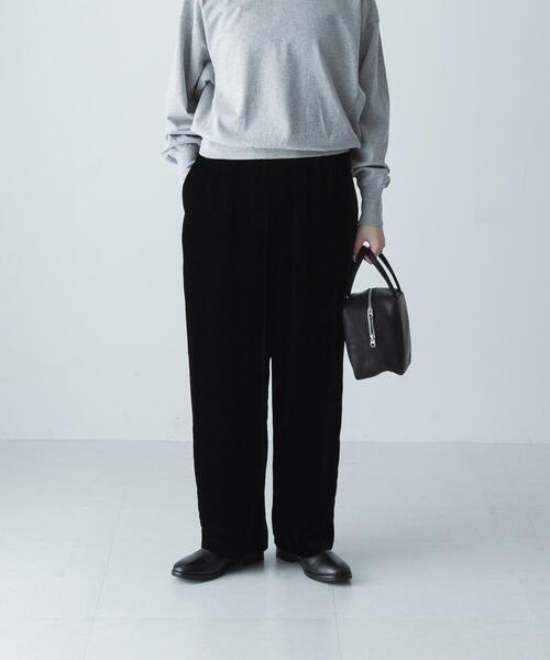 光の当たり方で表情を変えるベルベットシリーズ基布にシルクとナイロン、パイルにはレーヨンを使用。ナイロン混にすることで強度が増し、風合いは損なわず扱いやすいのが特徴。柔らかくしなやかで高級感のある佇まい。ウエストはイージー仕様の楽な着心地ながらも、ストンと落ちるストレートシルエットがきれい目な印象に。シャツやブラウスはもちろんニットとも好相性。シリーズのトップスとセットアップで着用いただくのも素敵です。オケージョンにもマッチし、カジュアルなアイテムと合わせれば日常にも着まわしがきく一品。【FABRIC】・マットな質感と上品な光沢がポイント・からだの線を拾いにくいベルベット特有の落ち感【POINT】・両脇には便利なポケット付き・スニーカーで外すスタイリングもおすすめ・ゆとりがありレギンスを重ねれば冬場も活躍【丈の調節について】かぐれでは丈感を調節できるようにイージー仕様の商品をご用意しています。総ゴムで紐が通してあるのでお好みのウエスト位置で着用いただけます。ぜひ参考にしてみてください。・短くしたい場合ウエストの高い位置で紐を結んでいただくか、ウエストを一折りすると短い丈感をお楽しみいただけます。・少し長くしたい場合やや腰穿きで着用し紐を結ぶとしっかりととまり、安心して着用いただけます。【2026 Spring/Summer】【26SS】※着用による毛羽の乱れは、衣料用ブラシなどで毛並みにそってブラッシングし整えてください。着用後は、形を整えてハンガーにかけて保管してください。毛倒れやシワができた時は、スチームアイロンを浮かしながらかけてください。※商品画像は、光の当たり具合やパソコンなどの閲覧環境により、実際の色味と異なって見える場合がございます。予めご了承ください。※商品の色味の目安は、商品単体の画像をご参照ください。▼お気に入り登録のおすすめ▼お気に入り登録商品は、マイページにて現在の価格情報や在庫状況の確認が可能です。 お買い物リストの管理に是非ご利用下さい。素材感透け感 : なし伸縮性 : なし裏地 : なし光沢 : ややありポケット : ありBLACK:161cm(Free) / 162cm(Free)FREE