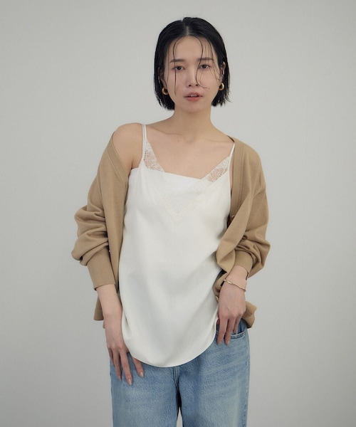 ■デザイン/シルエット ビンテージ感のあるサテンと繊細なフレンチレースを組み合わせたキャミソール。 フロントVネックが顔周りをすっきり見せ、上品で女性らしい印象に仕上げています。 ■素材 キュプラの強撚糸を使用したビンテージサテン素材。 滑らかな光沢とパウダリーな風合いが共存し、高級感とヴィンテージムードを同時に楽しめます。 ■コーディネート ロンTやTシャツとのレイヤードでカジュアルダウン、ジャケットやデニムとの組み合わせでマニッシュに。 幅広いスタイリングに活躍する1枚です。 ■モデル身長:165cm 着用サイズ:F ----------------------------- 裏地:なし 光沢感:あり 透け感:ホワイトややあり ポケット:なし 伸縮性:なし 生地の厚さ:薄手 -----------------------------