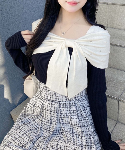 【大きなリボンとビジューがアクセントのオフショルニット】▼Designオフショルデザインと大きなリボンが特徴のニットが登場!さりげない肌見せがあざとさをプラスしてくれます♪リボン部分にはラインストーン&パールビジューが付いているので高見え間違いなし!オフショルのリボンの下がり紐部分は取り外し可能なのでイメージチェンジも可能。付けるとより可愛らしく、外すと大人っぽく着ていただけます!オフショルのリボンデザインがバスト部分を立体的にメイク。 ▼Stylingマーメイドスカートと合わせれば大人っぽい綺麗めコーデが完成♪ミニスカートと合わせれば、より可愛らしいガーリーコーデに。胸元のリボンの下がり紐部分は取り外し可能で2Way仕様です◎リボンの下がり紐部分を外してパンツスタイルにすると大人な印象に!・リボン下がり紐部分取り外し可・ニット製品のため生地に伸縮性があり、サイズに若干の誤差が生じる場合がございます。予めご了承くださいませ。 【以下ボルドー参考。カラーにより多少の誤差あり】・透け感:透けない・伸縮性:あり・生地の厚さ:普通・裏地:なし ▼Recommend・リボン・ニット・オフショル・リボン取り外し可・2WAY・フェミニン