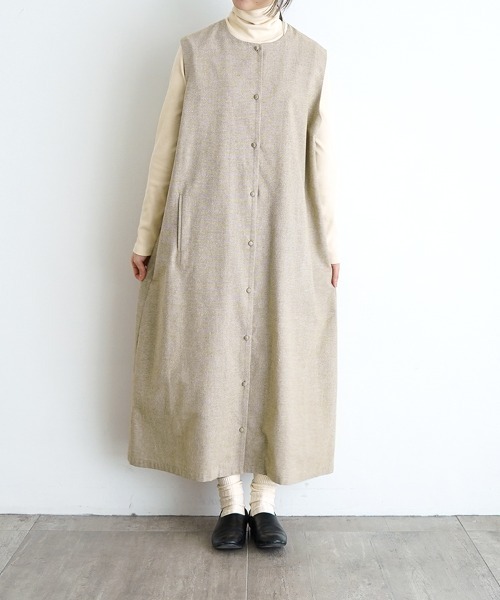 たなびく千鳥柄が特徴のロングワンピース。少し起毛したあたたかみのある生地は、コットンリネンの生地を使用。肌に馴染む、やさしい風合いに仕上がりました。袖がないタイプのワンピースなので、合わせるインナー次第で雰囲気が変わり、重ね着が楽しくなる一枚。前開き仕様で、ワンピースとしてはもちろん、羽織としても使える万能さも魅力です。コロンと愛らしいくるみボタン、便利な両サイドのポケットなど、日々の暮らしに寄り添うこだわりを詰め込みました。○ recommend point 少し起毛したあたたかみのある生地羽織としても使える万能さも魅力*パソコンのモニター環境や携帯電話の機種・設定によって、色合いや素材感が異なって見える場合がございます。ご理解の上、ご注文をお願いいたします。*サイズはすべて平置きの状態で計測しております。多少の誤差はご了承下さい。▽ 商品のお気に入り登録について完売商品の再入荷通知や最後1点のお知らせ、プライスダウンの通知を受け取ることができます。あわせてブランドのお気に入り登録をしていただくと、お得な情報をいち早くお届けいたします。- オオカミとフクロウ -木々の揺れ、小さな雨音、ふわりとなびく服のすそ。どこか少女のような可愛らしさを含ませた世界観で、いつもの生活にほんの少しの非日常を。