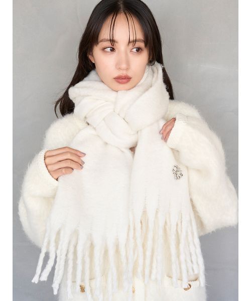 【艶めきビジューブローチ付き!冬コーデを彩るふんわり柔らかなシャギーマフラー】【Design/Styling】ラグジュアリーなブローチ付きのふんわりマフラーが届きました。ふわっとした優しい起毛感とソフトな肌触りが特徴の温かみのあるマフラーです。裾には程よいボリュームのフリンジを施し、華やかに仕上げました。取り外し可能なビジューのリボンブローチがセット。キラキラと光を放ち、存在感のあるエレガントなブローチはコートやバッグなどのアクセントにも使用できます。マフラーはくるっとひと巻きで程よくボリュームの出るサイズ感で、肩にふんわりかけたり、さまざまなアレンジが楽しめます。爽やかな印象のアイボリー、甘さと落ち着き感のある柔らかなベージュ、スモーキーカラーが大人な印象のライトブルーの3色展開です。※照明の関係により、実際よりも色味が違って見える場合があります。またパソコン・スマートフォンなどの環境により、若干製品と画像のカラーが異なる場合もございます。予めご了承ください。商品の色味は、商品単品画像をご参照下さい。 ※商品画像はサンプルのため、色味やサイズ等の仕様に変更がある場合がございますので、予めご了承ください。