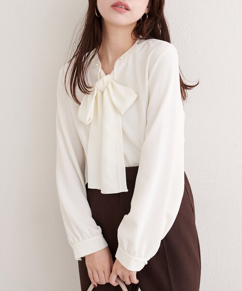 【2026SS natural couture】 2WAYリボンタイブラウス■Designリボンを結んで上品で華やかな印象に、リボンを外してシンプルなクルーネックブラウスとして、2つの表情を楽しめます。リボンはボタンで取り外し可能。袖口は程よいふくらみを持たせたデザインで、手首を華奢に見せてくれます。フロントには上品なパール調のボタンをあしらい、さりげないアクセントをプラスしました。■Stylingリボンタイを付ければ、オフィスやセレモニーなど、きちんとしたいシーンにぴったり。ジャケットやカーディガンを羽織れば、さらに上品な印象になります。リボンタイを外せば、カジュアルな着こなしにもマッチ。デニムやチノパンと合わせて、大人の抜け感のあるスタイリングを楽しめます。スカートと合わせてフェミニンに、パンツと合わせてクールに、着こなし次第で様々な表情を見せてくれる、優秀アイテムです。■Fabricさらりとした肌触り。==================お手入れ方法:マシンウォッシャブル裏地:なし透け感:淡色あり伸縮性:なし光沢感:なし生地感:さらりとした生地感==================※着用、お取り扱いの際は、商品に付いている品質表示とアテンションタグを必ずご確認ください。【お気に入り登録でお得な情報がいっぱい】・「商品のお気に入り登録」で再入荷通知や、ラスト1点の通知、セール通知をいち早く受け取ることができます。・「ブランドのお気に入り登録」で新商品や再入荷など、お得な情報を受け取ることができます!※店舗の入荷時期は商品によって異なります。店頭の在庫状況につきましては各店舗にてお問い合わせください。※撮影時の光の関係で、画面上の画像と実際のお色とでは若干の色差が生じる可能性がございます。また、ご覧いただいているモニター画面や、お使いのブラウザによっても、お色の違いがございますことをあらかじめご了承くださいませ。202511282026SS_natu26SS