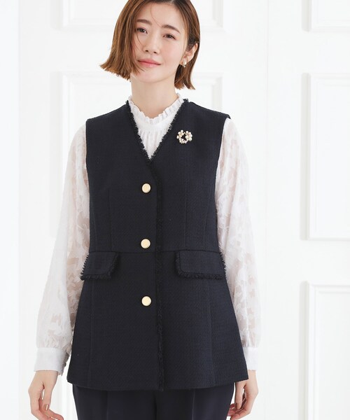 シーンレスに活躍する エフォートレスツイードジレ 【デザイン】 ツイル組織のツイード素材で仕立てたジレ。 セレモニーからお仕事、デイリーまで幅広く活躍する汎用性の高いデザインです。 スリーブレスならではの軽やかさと動きやすさで、ジャケットよりもリラックス感のある着心地に。 パネル切り替えとウエスト切り替えによって身体のラインに自然に沿い、美しいシルエットを描きます。 襟ぐりと前端、フラップ周囲にフリンジテープを挟み込み、華やかさをさりげなくプラス。 すっきりしたVネックにメタル調ボタンが映える、上品で端正な印象の一枚です。 【素材】 ツイル組織で織り上げたツイード素材を使用。 適度なハリと表情感があり、フォーマルすぎずデイリーにも馴染む絶妙なバランス。 ツイードならではの奥行きある表面感が、装いに品の良いニュアンスを添えます。 【スタイリング】 ブラウスやカットソーをインして通勤スタイルに、同系色のパンツを合わせてセレモニーやオケージョンにも。 デニムと合わせればカジュアルダウンも楽しめる、シーンレスに着回せる一着です。 【仕様】 ・ポケット数:横×2 ・裏地あり ※照明の関係により、実際よりも色味が違って見える場合があります。また、パソコン・スマートフォンなどの環境により、若干製品と画像のカラーが異なる場合もございます。 【26SS】 モデル情報:身長166cm B80 W59 H86 着用サイズ:02(M) 店舗へのお問い合わせ商品番号:768-45008 ●製品寸法: 01(S):着丈63cm B95cm 肩幅36cm 02(M):着丈64cm B95cm 肩幅37cm 03(L):着丈65cm B98cm 肩幅38cm 04(LL):着丈66cm B101cm 肩幅39cm 05(3L):着丈67cm B104cm 肩幅40cm 備考:重量:約450g(サンプルサイズ)