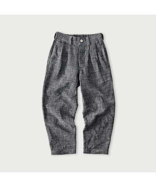 ざっくり凸凹味わい深いツイード綿と麻を紡いでできた糸は、節や植物のかけらが混ざったり、太さが違ったりとても可愛いのですが、織り上げるには技術と時間が必要です。より着心地よく、扱いやすく、私たちらしさも織り込んで、エレガントなツイードが出来ました。腰回りはゆとりをたっぷりと、裾にかけてテーパードが効いているためリラックスしながらお洒落に着こなせるペグトップパンツです。