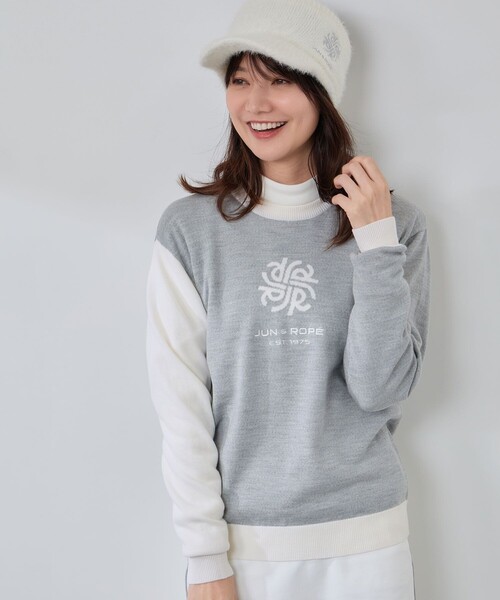 上質ウールで仕立てた、大人のバイカラーニットウール100%のビエラヤーンを使用した、ソフトな風合いとぬくもりが魅力のバイカラーニット。立体感のあるモノグラムインターシャがさりげないアクセントとなり、大人の上質カジュアルが素敵。カラーは、クリーンな印象のライトグレー×白、やわらかなラベンダー×白、今年らしいブラウン×ベージュの3色展開。着るだけでこなれ感が漂う冬の主役ニットです。ーーーーーーーーーーーーーーーーーーーーー裏地:なし光沢感:なし透け感:なしポケット:なし伸縮性:ありーーーーーーーーーーーーーーーーーーーーーーー【モデル着用サイズ】身長:167cm 着用サイズ:M※画像によっては実際の色味と異なる場合があります。正しい色味は生地アップ画像をご確認ください。※画像の商品はサンプルです。実際の商品とは仕様・加工・サイズ・素材が若干異なる場合がございます。JUN&ROPE’(ジュンアンドロペ)は、「Function GOLF」をコンセプトに、“おしゃれをする楽しさ”と“高いパフォーマンスを支える機能性”を両立させたゴルフウエアブランド。スタイリッシュなレディースゴルフウエアに加え、2024年秋には本格的なメンズ向けコレクション「NOIR(ノワール)」がデビュー。幅広いゴルファーに向けて、さらに多彩なラインナップを展開しています。また、女子プロゴルファーをはじめとする多くのプロ選手とも契約し、実際のプレーを支える“本物”のモノづくりも魅力。プロにも選ばれ、信頼される機能性とデザイン性を兼ね備えたアイテムは、ゴルフ場でもタウンユースでも活躍します。