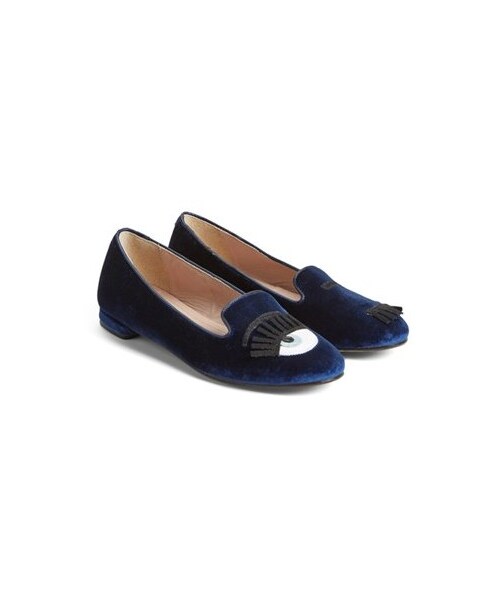 Fun, flirty, feminine and fabulous: Available in luxe velvet or shimmery glitter fabric, this insouciant slipper features a glossy, appliquéd winking eye complete with a pair of lush suede lashes. Textile upper/leather lining and sole. By Chiara Ferragni; made in Italy. Salon Shoes.