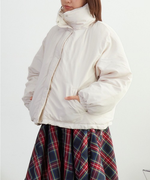 スタンドカラーで首回りまでしっかり暖かい中綿ダウンジャケット。 女性らしい丸みとボリュームのあるフォルムで冬に活躍する事間違いなし。 オーバーなサイズ感なのでニットなど厚手のインアーにももたつきにくいです。