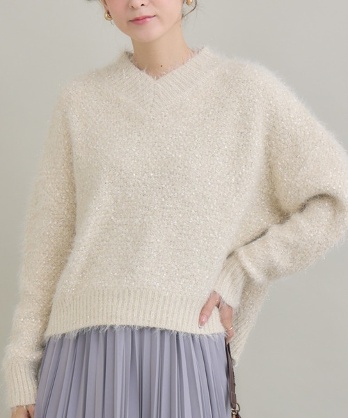 【KATHARINE ROSSオリジナル】上品な輝きを添えるVネックプルオーバー[素材]・ポリエステル・ナイロン・アクリルの混紡素材を使用し、柔らかく厚みのあるニットに仕上げました。・ふんわりとした着心地で、寒い季節でも暖かく快適に過ごせます。[デザイン]・ラメ糸を使用したフェザーネップの風合いが、光の角度でさりげなくキラキラ輝きます。・やや詰まり気味のVネックは、普通のVネックよりも落ち着いた印象で首元をすっきり見せます。・身幅広めのショート丈デザインで、体型を自然にカバーしつつトレンド感のあるバランスの良い着こなしが可能。・厚手で暖かく華やかさもあるため、オフィスカジュアルから休日のお出かけまで幅広く活躍。[スタイリング]・ワイドパンツと合わせて、ゆったり感と華やかさを両立させた大人カジュアルに。・シンプルなスカートに合わせて、アクセサリーを引き立てる洗練されたお出かけスタイルに。■光沢感:あり■透け感:なし■伸縮性:あり■生地の厚さ:厚手※照明や光の当たり具合で色味が違って見える場合があります。※システムの都合上、店舗より入荷が遅れる場合がございます。【お買い物をよりお楽しみいただくために】・商品のお気に入り登録をおすすめします!♡マーククリックで登録できます。完売カラーの再入荷や、ラスト1点になったときの通知、セールの際に通知などお得な情報を受けることができます。・ブランドのお気に入り登録もご一緒にお願いいたします!新商品や再入荷、などいち早くブランドの最新情報をお届けします。