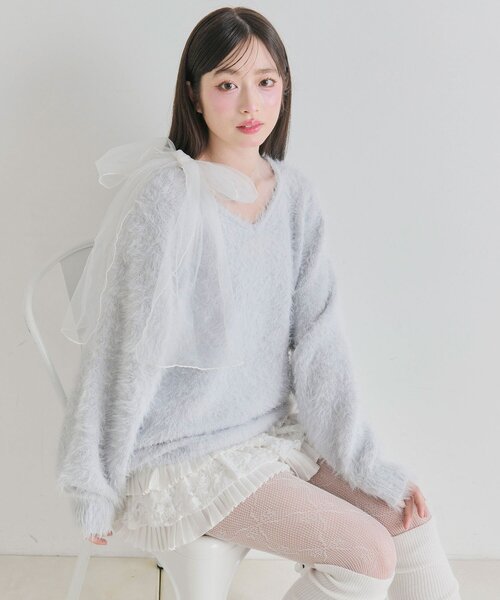ふわふわのチュールリボンが目を惹くニットチュニック■デザイン・触り心地の良いシャギーニットに、大きなリボンをあしらったガーリーデザイン。・リボンは肩、前、後ろ、ホルターネックと付け替え可能で、前後2wayなのでアレンジ次第でいろんな着こなしを楽しめます。・ゆったりシルエットで体型カバーしつつ、女の子らしい可愛さも叶います。・シャギー素材なのでふわふわで、毛玉もできにくく長く着用していただけます。■カラー・オフ/ピンク/イエロー/サックス/トップグレーの5色展開■スタイリング・ミニボトムを合わせてガーリーなミニワンピース風に着こなすがおすすめ。・足を出したくない方はすっきりとしたシルエットのパンツを合わせるとバランスよく着られます。・スニーカーやキャップなどでカジュアルダウンさせても、抜け感が出てかわいいです。-----------------------------裏地:なし光沢感:なし透け感:なし伸縮性:あり手洗い:可能タンブラー乾燥:不可アイロン:110℃まで-----------------------------※着用、お取り扱いの際は、商品についている品質表示とアテンションタグを必ずご確認下さい。※ご覧のモニター環境や撮影環境により実際の商品と多少色味が異なって見える場合がございます。ご理解の程よろしくお願いいたします。※引っかけ注意・粗い組織のものや、表面に凹凸があってルーズな組織のもの表面に糸が浮き出ているものは、ちょっとした不注意から引っかけてしまいがちです。取り扱いの際は取り扱い絵表示確認の上、十分注意してください。・着用時にベルトや、バックや周囲の壁など表面の粗いものとの摩擦や引っかかりに注意してください。・水洗いやクリーニングの際にも他の物ものとの引っかかりに注意して下さい。■お気に入り登録のおすすめ【気になるアイテムを登録】ハートをクリックしてお気に入りに登録すると完売カラーの再入荷やラスト1点の通知、セールの通知を受けとることができます。【ブランドを登録】新商品や再入荷、セール通知など、いち早くブランドの情報を受けとることができます。