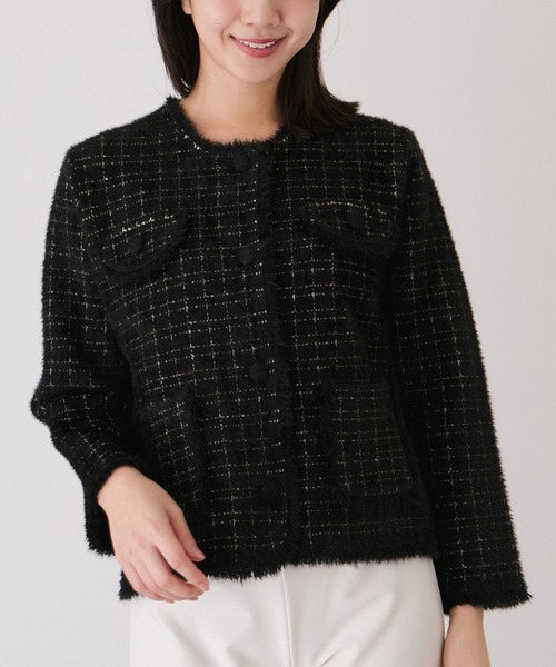 「華やかさ」と「温もり」を纏う。着るだけでリュクスなムードが漂うシャギーニットカーディガン。【デザイン・シルエット】・ノーカーラーのラウンドネックが、インナーの襟元やアクセサリーを際立たせ、顔周りをすっきりと見せる。・ツイード風のチェック柄の編み地に、シャギー糸を施し、温かみと立体感をプラス。・両胸のフラップと裾に施されたポケットは、フリンジで縁取られ、デザインの遊び心とトラッドなムードを演出。・シンプルなくるみボタンがフロントに並び、素材の風合いを最大限に引き立てる。・羽織りとしてもトップスとしても活躍。秋冬のイベントシーズンに欠かせない万能アイテム。【素材感】・シャギー糸を使用し、ふわふわとした肌触りのニット素材。・裏地なしで、レイヤードしやすく、ストレスフリーな着心地。【カラー】 02 クロ 12 シロ 48 サックス【スタイリングポイント】・Iラインスカートやテーパードパンツと合わせ、シックで知的な通勤スタイルに。・ボタンを全て留めてトップスとして着用し、ロング丈のプリーツスカートと合わせたレディライクな装い。・デニムの上に羽織りとして着用し、大人のこなれたミックススタイル。・フリルブラウスやタートルネックをインナーに重ね、ネックラインから覗かせた華やかなレイヤード。・足元はロングブーツやヒールパンプスを合わせ、クラシカルなムードを後押し。裏地:なし光沢感:なし透け感:なしポケット:あり伸縮性:あり生地の厚さ:普通ボタン:ありその他仕様:なし季節:春秋冬※撮影時の光、お使いのモニター環境によって色の見え方が違う場合がございます。予めご了承ください。モデル身長:172cm 着用サイズ:M