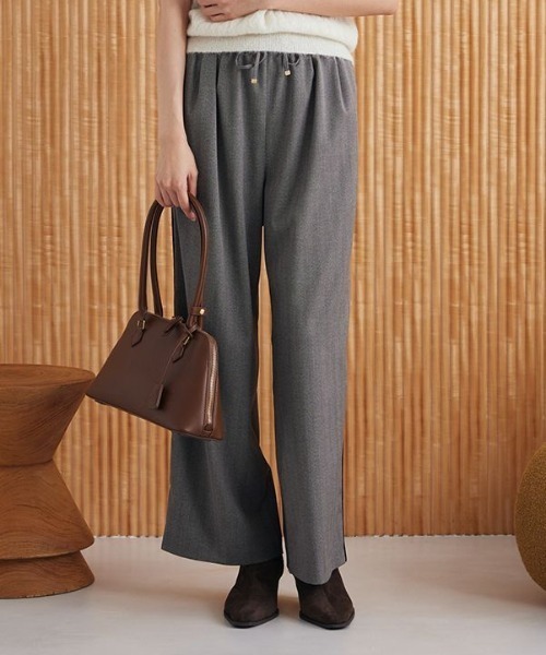【モードに着こなせる、秋冬デイリーパンツ。ヘリンボーン素材のイージータイプで、こなれた印象に】【Design/STyling】トレンド感あるヘリンボーン素材を使用したイージーパンツ。旬のトラッドなムードがありながら、ウエストゴムで裏地なしの、ノンストレスな一着に仕上げています。ゆったりとしたシルエットで、穿くだけでこなれた印象が作れるのがうれしいポイント。サイドには、濃色のサテン生地でライン状にパイピングを施すことで、モード感と脚長効果をプラスしています。フロントのストリングスは、先端にメタルパーツがついているので、キラリとリュクスに光ります。【Fabric】ウール調のヘリンボーンは、柔らかく肌ざわりのよい素材。きれいめな落ち感が、スタイリッシュな着こなしを演出してくれます。カラーは2色をご用意。モードな印象の<GRY>、トラッドで今年らしい<BRW>で展開しています。※照明の関係により、実際よりも色味が違って見える場合があります。またパソコン・スマートフォンなどの環境により、若干製品と画像のカラーが異なる場合もございます。予めご了承ください。商品の色味は、商品単品画像をご参照下さい。 ※商品画像はサンプルのため、色味やサイズ等の仕様に変更がある場合がございますので、予めご了承ください。