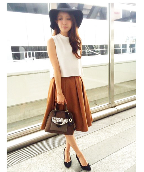 短すぎず長すぎず、上品に着こなせるミディアム丈 上半身をコンパクトにまとめることがポイント トップスやアウターはコンパクトなものを合わせれば、 バランスよいコーディネートになります。 ブラウスやシャツの場合はすそをスカートの中に入れて、 ウエスト部分をすっきりまとめるのがおススメです。