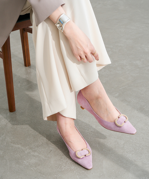 トゥが少し長めのシルエットと品のあるオーバルプレートがポイントのパンプス。金具部分を極力細くし中の色を配色で効かせたパーツは、いちからこだわって作成したオリジナルパーツです。モチーフの主張が強くないので、オンシーンだけでなくオフのお洋服にも合わせやすい1足。3.5cmの低寸ヒールですが、くびれデザインでしっかりヒール見えするパンプスです。**********************【シューフィッターsaitouコメント】おすすめの足型:足幅普通/スクエア型saitou普段サイズ:24.5-25cm足特徴:外反母趾、ギリシャ型サイズ感:普通~ややゆったりめ着用サイズ:24.5?/素足で試し丁度良く感じました。外反母趾の部分はちょうど骨を包み込んでくれるので、指先の締め付けを感じずに安心して履けました。足幅細めの方は、インソール入れて頂くか、1サイズ下をお試ししていただいても良さそうです。履き心地:インソールのクッションが柔らかいです。ヒールが3.5cmなので、ヒールの高低差を感じずに歩きやすく感じました。リフトの接地面も細すぎずないので安定感も程よくあります。普段パンプスはあまり履かない方にもおすすめです。【スタッフ着用コメント】《スタッフU》普段サイズ:23.5/着用サイズ:23.5サイズ感: 素足で履いてやや大きめ履き心地:いつものサイズで履いて大きく感じたので23cmで丁度よく履けそうでした。横幅の締め付けもなく幅広ですが窮屈感なかったです。***********************サイズによりヒールの高さが多少前後することが御座います。予めご了承ください。*照明の関係により、実際よりも色味が違って見える場合があります。またパソコン・スマートフォンなどの環境により、若干製品と画像のカラーが異なる場合もございます。*商品の色味は、商品アップ画像をご参照ください。