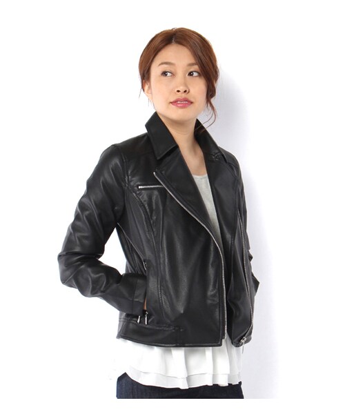 適度に伸縮性があるフェイクレザーを使用したライダースジャケットです。ファスナーを開ければジャケット風に、閉じれば小さめ衿のアシンメトリーデザインに変化するから2通りのスタイルが楽しめます。ピリリとした着こなしのスパイスとして大活躍すること間違いなしです。