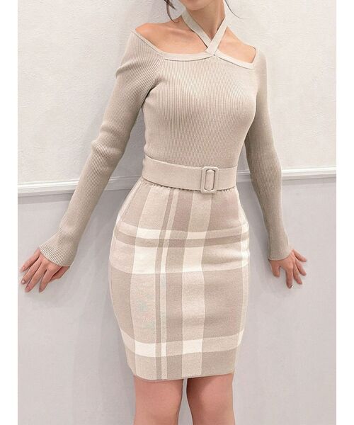 チェック柄が目を引くミニワンピ ▽デザイン▽ オリジナルのジャガードチェックが目を惹くニットワンピース。 トップス部分はクロスデザインにすることでデコルテを美しく華やかな印象に。 スカートはタイトなシルエットで甘さを抑え、スタイルアップできるアイテムに仕上げました。 ▽カラー▽ 黒、オレンジ、ベージュの3色展開。 ▽スタイリング▽ 1枚でコーデが完成するミニワンピ。 デイリー使いはもちろんデートや特別な日にもおすすめのアイテムです◎