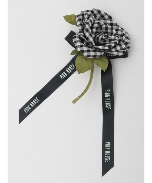 シリーズに合わせてギンガムチェックでローズモチーフを作ってそのまま可愛らしいミニコサージュに。 一厘咲きのローズに、ロゴ入りサテンリボンを結んでキュートで華やかに仕上げました。 シリーズのコーディネイトはもちろん、他のコーディネイトやバッグや帽子などに付けても可愛いのでオススメです。 小ぶりなので、色違いで重ね付けしても可愛いのでいろいろとお楽しみください。