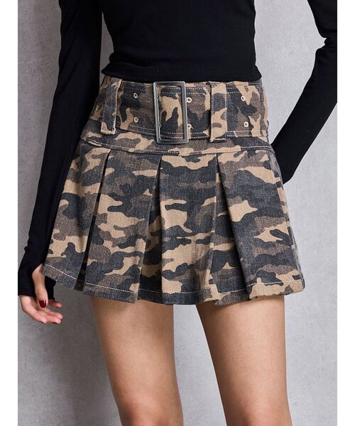 ■デザイン 取り外せる共生地のワイドベルト×プリーツディテールで全体にボリュームをプラスしたデザイン。 グレー加工を入れたアイスカラーと、落ち着いたインディゴカラー、ミックスのベージュベースカモフラ柄の3色展開で、 ストリートにも甘辛にも、幅広くマッチする万能デニムアイテムです。 左脇ファスナー開きにし、着脱もしやすい仕様。 ミニ丈でも、インナーショーツ付きなのが嬉しい1着。 ■スタイリング タイトショート丈のトップス+厚底シューズ合わせで脚長効果抜群スタイリングが◎ ニットアイテムと合わせても相性が良いです。 ■商品のお気に入り登録 再入荷通知やラスト1点、お得なプライスダウンの情報も受け取ることができます。 ぜひご登録ください◎ ・・・・・・・・・・・・・・・・・・・・・・ ※着用画像はフラッシュの加減で実際の製品と色味等が異なる場合がございますので、生地のズームアップ画像をご確認ください。 ※ご利用の端末画面の設定により実際の商品と色味が異なる場合がございます。 【商品特徴】透け感:なし伸縮性:なし生地の厚さ:普通サイズ感:普通裏地:なしポケット:なし