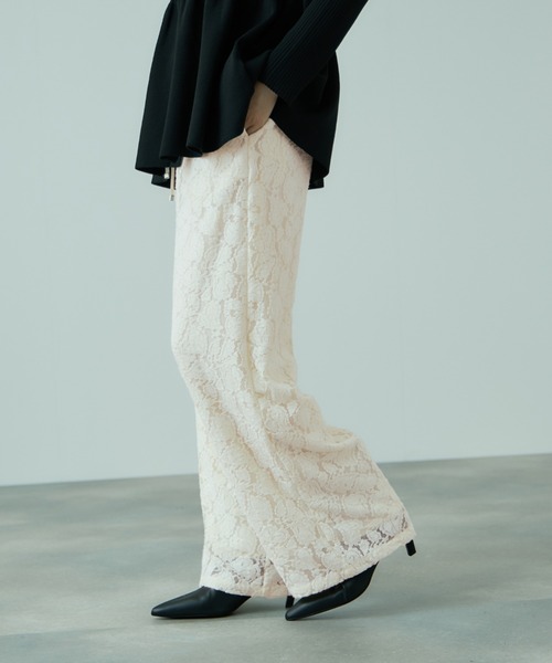 ●POINT起毛感があり、ウォーム感を感じられるテクスチャーのレース素材を使用したフェミニンカジュアルなワイドパンツです。ウエストはぐるりゴムギャザー仕様でフェミニンフェイスなのにイージーな履き心地です。デニムなどとあわせて秋冬のフォークロア風スタイルやニットなどにあわせてリラクシーなスタイルなどにおすすめの一枚です。また、スウェットトップスなどとの外しアイテムとしても注目です。----------------------------------透け感:淡色のみややあり厚さ: 普通伸縮性:あり裏地: ありポケット: あり--------------------------------------------------------------------------------------------------洗濯方法家庭洗濯:液温は40℃を限度とし、手洗いができる。自然乾燥:日蔭の吊り干しがよい。アイロン:底面温度120℃を限度としてアイロン仕上げができる。ドライクリーニング:ドライクリーニング禁止。----------------------------------------------------------------■モデル身長 165cm 着用サイズ M※画像の商品はサンプルとなりますので実際の商品と仕様、加工、サイズが若干異なる場合がございます。※お客様のモニター環境により実際のお色と多少異なる場合がございます。※撮影状況や光の当たり具合により、色合いが異なって見える場合がございます。----------------------------------▼商品のお気に入り登録ハートマークをクリックし、お好きなカラーを選んでお気に入りに登録完売カラーの再入荷通知や、ラスト1点の通知、セールの通知も受け取ることができます。▼ブランドのお気に入り登録新商品や再入荷等、いち早くブランドのお得な情報を受け取ることができます。----------------------------------