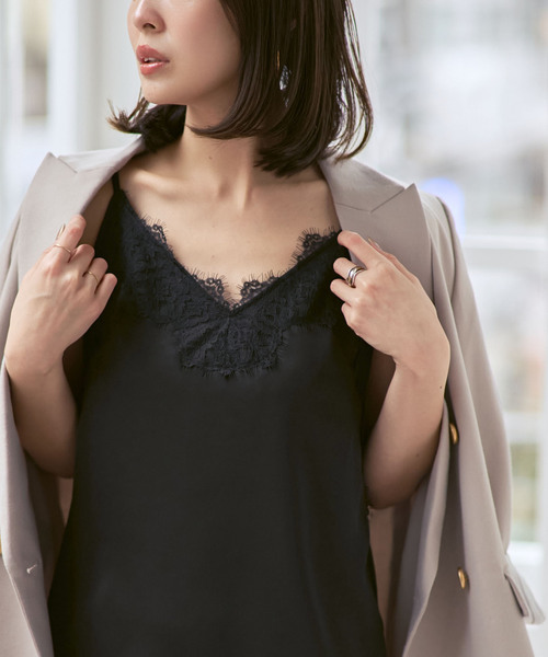 繊細なリバーレースを施したサテンキャミソール。ジャケットのインナーやニットのレイヤードなどと、取り入れるだけで今年らしい新鮮な着こなしを演出できる1枚。またショルダー部分はアジャスター付きなので、襟ぐりの空き具合の調整が可能なのもうれしいポイントです。**********************透け感:あり(ホワイト・)なし(ブラック)裏地:なし伸縮性:なし光沢感:あり生地の厚さ:普通**********************※取り扱いについては、商品についている品質表示でご確認ください。※こちらの商品は、NOBLEでの取り扱いになります。直接店舗へお問い合わせの際はNOBLE店舗へお願い致します。※照明の関係により、実際よりも色味が違って見える場合があります。またパソコン・スマートフォンなどの環境により、若干製品と画像のカラーが異なる場合もございます。※商品の色味は、商品アップ画像をご参照ください。ブラック着用スタッフ身長:155cm 着用サイズ:フリーホワイト着用スタッフ身長:160cm 着用サイズ:フリーモデルサイズ:身長:163cm 着用サイズ:フリー本体:手洗い可能