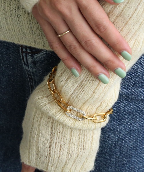 【存在感抜群の大きめチェーンブレスレット】 手元に華を添えてくれる、大振りのチェーンデザインのブレスレット。 センターにはきらっと輝くパヴェデザインのパーツがアクセントに置かれています。 シンプルなコーデのアクセントにはもちろん、ボリュームのあるトップスにも負けない存在感があるので、ポイント使いにぴったりなアイテムです。 【pick up points】 ・パヴェデザインのパーツが上品なアクセントに ・金属アレルギーを引き起こしにくいステンレス製 ・丈夫で傷がつきにくく、錆びにも強く変色しづらいので長くお使いいただけます。 *注意事項 撮影場所やイメージにより実際の商品と色味が若干異なる場合がございます。 商品のお色味はカラーバリエーション画像をご参照ください。 ◆《お気に入り登録》のおすすめ◆ 気になる商品は「お気に入り」登録がおすすめ。 ・「商品のお気に入り登録」で再入荷通知や、 ラスト1点の通知、セール通知も受け取ることができます! ・お気に入り登録商品は、マイページにて現在の商品詳細(価格情報や在庫状況)が確認が可能です。 お買い物リストの管理に是非ご利用下さい!