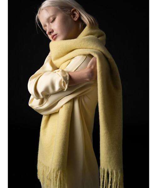 ふんわりとした肌触りが心地よいイエローカラーマフラー。フロントにはレザー調のブランドロゴ入りタグを施しています。生地端にあしらわれたフリンジが華やかな風合いを演出。シンプルなコーディネートのアクセント使いに大活躍してくれるアイテムです。※商品画像は、撮影環境やお客様のご利用のPC・スマートフォンのモニター環境などにより実物と色味に差異がある場合がございます。【その他採寸】F 全長:196cm