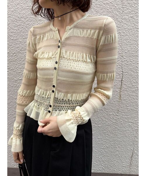 上質感が際立つシアーな大人ニット。ボーダーでキレイめ過ぎずカジュアルにも■デザインコメント部分的にシアー糸で編み立て、女性らしくボーダーを表現したニットカーディガン。シャーリングが立体的な表情を作り、1枚で着映えするアイテムです。釦をしめて、プルオーバーとして着用していただくのがオススメです。■スタイリングポイント・チノパンやワイドデニムなど、異素材パンツとの合わせが絶妙・デニムパンツとカジュアルに、ナロースカートや女性らしいアイテムとも相性が良く活躍間違いなし【修正コメント】前下がり1センチほど下がります。---------------------------------------------------透け感:あり裏地:なし生地の厚さ:薄手洗濯:-伸縮性:ありポケット:なしジップ:なし---------------------------------------------------【 ZOZOTOWNでお買い物を楽しむ便利機能 】♡商品のお気に入り登録完売カラーの再入荷時、ラスト1点の時、セール開始時にお知らせします。予約アイテムが入荷して通常販売になった時もお知らせしてくれます!その他お得な通知も盛りだくさんです。 ♡ブランドのお気に入り登録新商品や再入荷、セール情報など、いち早くブランドのお得な情報を受け取ることができます。ぜひご活用ください!