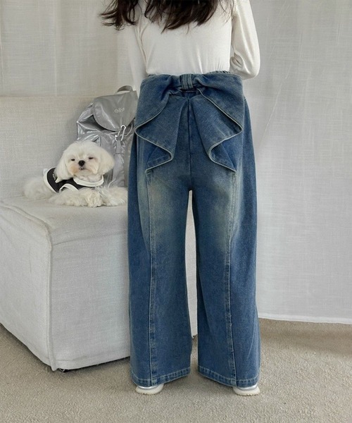 柔らかデニムにビッグリボンをあしらった、後ろ姿まで主役級のワイドデニムパンツ。 ワイドシルエットとハイウエストデザインで、動きやすさとスタイルアップの両方が叶う一本。 トップスをインして、存在感のある後ろのリボンを引き立てるコーデがおすすめです。 いつものトップスを合わせるだけでかわいいコーデが完成します。 通園・おでかけ・写真撮影にも映える、トレンド感たっぷりの主役パンツです。
