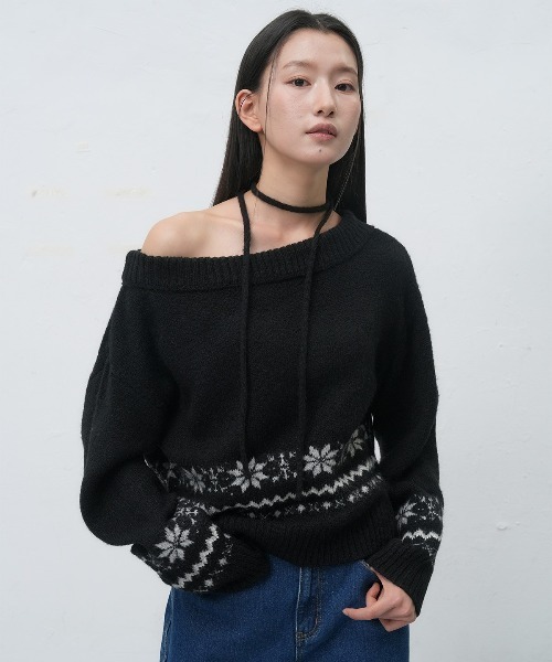 [DESIGNER COMMENT]スノー柄が目を引く、ボートネックのニットプルオーバー。ワイドなボートネックラインが、女性らしい抜け感のあるシルエットを演出します。同素材のストラップが付属しており、ウエストマークしたり肩に掛けたりと、気分に合わせて様々なスタイリングが可能。ウール混ニットの柔らかな風合いで、あたたかく快適な着心地も魅力。冬のコーディネートに季節感をプラスしてくれる一枚。[DETAIL INFO]伸縮性:ややあり裏地:なし透け感:なし厚さ:普通[WASHING TIP]ドライクリーニング※洗濯の際は、製品のケアラベルに従ってください。