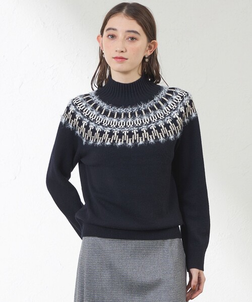 立体ジャカードが映えるニットプルオーバー 【デザイン】 ややゆったりとしたラグランスリーブのプルオーバーです。 身頃はジャカード柄を2種類の表面感のある異素材で求心状に編み込み、伝統的なフェアアイルニットをモダンな印象に仕上げました。 スカートでもパンツでも合わせやすい、着回しのきくサイズ感です。 【素材】 繊維が細く柔らかなウール原料を使用し、カシミヤを入れることでとても肌触りのよい膨らみのある素材に。 着用後は素材にあったブラシでブラッシングしていただくと、より長く風合いをお楽しみいただけます。 配色糸には和紙を使用し、華やかでモダンな表面感をプラスしました。 手洗い可能でお手入れしていただきやすくなっております。 ※この商品はサンプルでの撮影を行っています。 実際の商品とイメージ、仕様が異なる場合がございます。