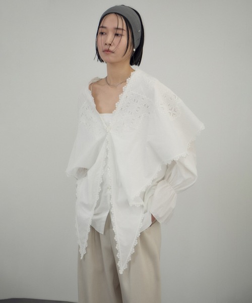 軽やかなコットン素材で季節を問わず着回せ、結び方や羽織り方で多彩なアレンジが可能。刺繍スカーフをリメイクしたケープ風ブラウス■デザイン/シルエット繊細な刺繍が施されたスカーフ2枚をリメイクし、ケープのように仕立てた存在感のあるブラウス。1枚で華やかさが生まれ、動くたびに揺れるケープデザインがスタイルを印象的に見せます。■素材上質なコットン100%のローン素材を使用。軽くソフトな風合いと滑らかな表面感が特徴で、ほどよい透け感が抜け感をプラス。ロングシーズン快適に着用できる万能素材です。■コーディネートケープを前で結んでフェミニンに、釦を外してカーディガンのように羽織れば抜け感あるスタイルに。シンプルなボトムと合わせるだけで主役級コーデが完成します。■クロスレースシリーズ一覧・商品番号:SHF36010 商品名:クロスレースマルチキャミソール・商品番号:SHH36010 商品名:クロスレースケープブラウス■モデル身長:165cm 着用サイズ:F -----------------------------裏地:なし光沢感:なし透け感:ややあり伸縮性:なし生地の厚さ:やや薄手-----------------------------