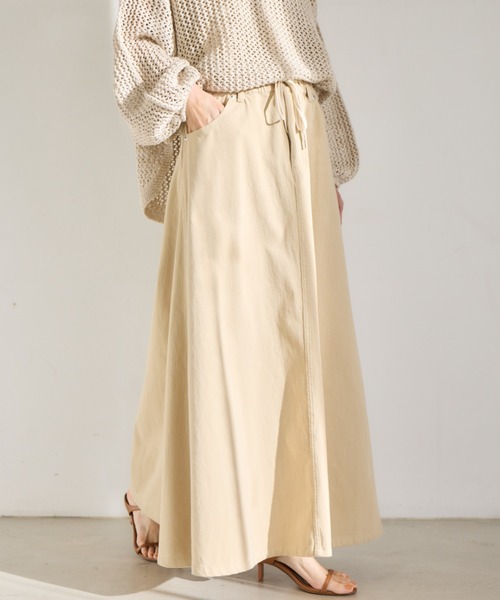揺れるシルエットが大人のこなれ感を演出してくれるデニムスカート・たっぷりとあるけまわしが特徴のデニムマキシスカート・動くたびに揺れるシルエットが大人のこなれ感を演出・ウエストゴム仕様でイージーな着心地・配色のコードでトップスをインして着る時も腰位置が高く見えるようになっています◆同素材のアイテムはこちら◆598510:NEWカットワイドデニム250762:カットデニムシャツジャケット598512:カットデニムオーバージャケット【スタイリング】ゆったりめなトップスを合わせる時は抜け感が出るように、デコルテが出るトップスがおすすめ。【素材】お手入れ方法:ハンドウォッシャブルペールブルーとインディゴは今までのカットデニムと同素材。ベージュは春の訪れを感じる新色。ベージュはデニムではなく、ジャージのツイル組織のものに生地染めをした上で、製品で洗い加工を施し、アタリ感を出す事で程よいヴィンテージ感を表現。ストレッチ性もあり軽く履き心地の良い素材なので通年おすすめです。---------------------------------透け感:透けない伸縮性:あり生地の厚さ:普通裏地:なし※こちらは参考情報となります。カラーにより多少の誤差がございます。※ベージュで計測しています。---------------------------------【原産国】CHINA お買い物をお得にもっと楽しく!上手な活用方法>>>▼商品のお気に入り登録▼完売カラーの再入荷通知や、ラスト1点の通知、プライスダウンしたセール通知も受け取ることができます。▼ブランドのお気に入り登録▼新作や再入荷等、いち早くブランドのお得な情報を受け取ることができます。【ご注意】※屋外の光や照明の当たり具合で、実際の商品の色味とカラー別画像の色味に若干の違いが発生する場合がございます。詳細画像と併せてご確認の上、ご注文いただきますようお願い致します。※サンプルにて撮影をしておりますので、実際の商品とは色味・仕様や加工・サイズ等が若干異なる場合がございます。予めご了承くださいませ。