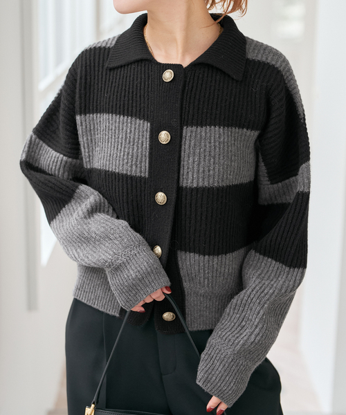 上質素材と抜け感で楽しむ、大人カジュアルカーディガン。暖かさと軽さ、肌触りの良さを兼ね備えた上質なエクストラファインウール、カシミヤ、ナイロン混紡の紡毛糸を使用しています。多本取りの畦編みによる膨らみのあるラガーボーダーで、しっかりとした肉感に仕上げました。袖と裾のリブには振り柄を組み合わせたニットテクニックをアクセントにしています。大きめの肩幅にコンパクトな着丈で自然な抜け感を演出。ポロシャツ衿とエンブレム入りの金釦使いが、カジュアル過ぎず上品な大人カジュアルを叶えます。釦を少し開けて襟を抜くと、程よく力の抜けた着こなしに。しっかりとした肉感なので、インナー次第ではブルゾン感覚の軽めアウターとしても活躍します。※取り扱いについては、商品についている品質表示でご確認ください。※こちらの商品は、Spick & Spanでの取り扱いになります。 直接店舗へお問い合わせの際は Spick & Span店舗へお願い致します。※照明の関係により、実際よりも色味が違って見える場合があります。またパソコン・スマートフォンなどの環境により、若干製品と画像のカラーが異なる場合もございます。※商品の色味は、商品アップ画像をご参照ください。グレーベース、ブラウンベース着用スタッフ:160cm 着用サイズ:フリー詳細着用スタッフ:163cm 着用サイズ:フリー本体:ドライクリーニング