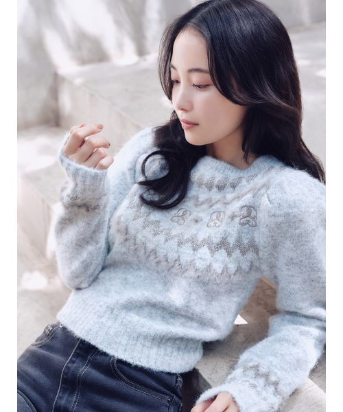【サステナ素材を使用!オリジナルでお作りしたフェミニンなノルディック柄ニットプルオーバー】【Design/Styling】ボディの糸にはウール混のやや毛足のあるふっくらとしたニットを使用し、その他の柄部分にはラメ糸とフェザー糸を使用して表情を出したシーズンムードを高めるノルディック柄ニットプルオーバーが到着。カジュアルなデザインですが、コンパクトなサイズ感と、パワショルデザインでレディに仕上げているのもポイント。ハイウエストボトムやボリュームのあるボトムとも合わせやすいデザインです。ノルディック柄はSNIDELオリジナルで作っていて、SNIDELロゴ刺繍を施しました。フロントだけでなく、後ろ見頃や袖にも柄を入れ、華やかに仕上げています。ペタルバルーンスカショーパン(SWFP255098)合わせのトレンド感のあるスタイリングがおすすめです。【Fabric】ミント配色の柄を施したアイボリー、ワントーンで模様を施したグレー、ホワイトの柄を施したピンクの3色展開です。ピンクのみ、ボディにラメフェザー糸を使用し、オーロラカラーでキラキラとしています。ピンク以外のニットのボディ糸でサステナ素材を使用しています。【Recycled Polyester】使用後のポリエステル商品を粉砕し、糸や生地にアップサイクルさせた「POST CONSUMER」、工場での製造過程で発生する端切れや糸くずなどを使用する「PRE CONSUMER」をSNIDELでは使用しています。透け感;なし裏地;なし伸縮性;あり光沢感;なし生地の厚さ;普通【おすすめ骨格タイプ】■骨格ウェーブ※照明の関係により、実際よりも色味が違って見える場合があります。またパソコン・スマートフォンなどの環境により、若干製品と画像のカラーが異なる場合もございます。予めご了承ください。商品の色味は、商品単品画像をご参照下さい。 ※商品画像はサンプルのため、色味やサイズ等の仕様に変更がある場合がございますので、予めご了承ください。
