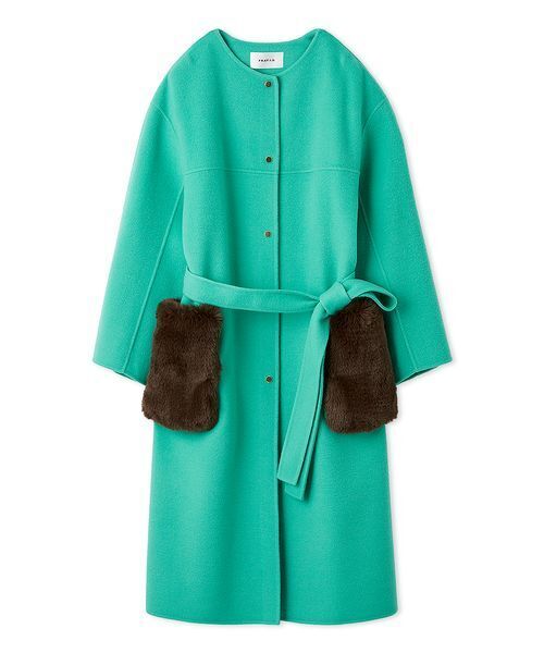 【華やかに着映えするファーポケット付きリバーコート】【Design/Styling】リバー縫製で軽やか&柔らかくお作りしたノーカラーコートのポケットに、インパクトのあるエコファーをあしらいました。フロントのゴールドボタンも着映えをアシスト。華やかなデザインですが、大人っぽく楽しんでいただけるようにストレートシルエットでシャープに。ノーカラーのすっきりとした襟元や、ボトムがさりげなくのぞくスリットで抜け感も加えました。長く愛用していただけるように、襟ぐりはグログランテープの見返し仕様でしっかり厚みを持たせ、耐久性を高めています。リバー縫製で軽くて柔らかに仕上げた生地は、高品質なサステナブル素材。製造工程で染されてきた原料を資源としたアップサイクル品で、地球環境に配慮しながらおしゃれを楽しめます。ファー部分の取り外しが可能なので、気分に合わせてシンプルなノーカラーコートとして楽しんでも。優しいBEG、大人な甘さのPNK、配色ファーでキャッチーに仕上げたTUQの3色展開です。※照明の関係により、実際よりも色味が違って見える場合があります。またパソコン・スマートフォンなどの環境により、若干製品と画像のカラーが異なる場合もございます。予めご了承ください。商品の色味は、商品単品画像をご参照下さい。※商品画像はサンプルのため、色味やサイズ等の仕様に変更がある場合がございますので、予めご了承ください。