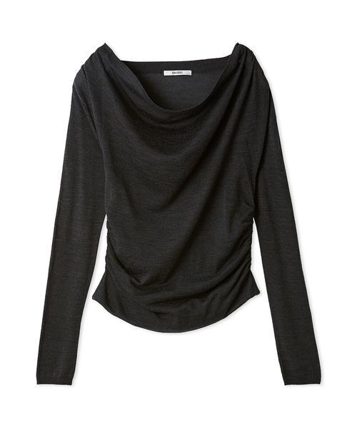 【トレンド感満載な抜け感のあるシルエットを叶えるアシメネックドレープニットトップス】【Design/Styling】ウール混のやや艶のあるニットを16のハイゲージの天竺編みで仕上げたアシメネックドレープニットトップスです。網目の細やかな16ゲージにすることで、より上品な仕上がりに。ややシアー感のある薄手のニット生地を使用することで。襟元のドレープやウエストのギャザーディテールが綺麗に出るように仕上げました。襟元はトレンド感のあるドレープデザインですが、右肩を落としてワンショルダーとしての着用も可能です。袖はやや長めに設定しています。サイドにゴムでギャザー感を出し、クシュっとニュアンスのある着こなしを叶えます。デコラティブシフォンフレアスカート(SWFS255107)合わせがおすすめです。【Fabric】定番人気のアイボリー、大人な印象のチャコールグレー、鮮やかなレッド、柔らかな印象のライトピンクの4色展開です。透け感;ややあり裏地;なし伸縮性;あり光沢感;なし生地の厚さ;やや薄手【おすすめ骨格タイプ】■骨格ウェーブ■骨格ナチュラル※照明の関係により、実際よりも色味が違って見える場合があります。またパソコン・スマートフォンなどの環境により、若干製品と画像のカラーが異なる場合もございます。予めご了承ください。商品の色味は、商品単品画像をご参照下さい。 ※商品画像はサンプルのため、色味やサイズ等の仕様に変更がある場合がございますので、予めご了承ください。
