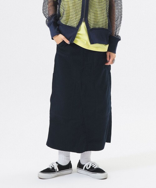 ボーイなスタイリングに似合うスカート ■デザイン 70年代ワークブランドのダブルニーペインターパンツのディテールをベースに、〈BEAMS BOY(ビームス ボーイ〉)らしいエッセンスでスカートへアレンジ。ワーク感のある力強さと女性が取り入れやすいバランスを両立しています。 ■コーディネート 無骨なワークデザインが主役になるため、シンプルなTシャツやスウェットと合わせるだけでこなれた印象に。タイトすぎないシルエットが足元の選択肢も広げ、スニーカーからブーツまで幅広く相性良くまとまります。 ■サイズ 程よいフィット感と動きやすさを両立した設計。ワークディテールが映えるようにラインを調整し、日常でも取り入れやすいサイズ感に仕上げています。 ■素材 タテヨコともにT/C(ポリエステル×コットン)を使用したチノ素材。綿100%より軽く、ポリエステル混ならではの自然な光沢とシャキッとした立体感が特徴。ワークディテールを上品に引き立てる、扱いやすい素材です。 ■ケア方法 洗濯可(詳細は商品についている品質表示ラベルをご覧ください) 【D.GRN】Model : H161 B76 W60 H82 Size : 0 【D.NAVY】Model : H161 B76 W60 H82 Size : 1 ※アイテムサイズは商品サンプルを採寸しているため、実際の商品と多少の誤差が生じる場合がございます。 ※画像の商品はサンプルのため、実際の商品と「仕様」「色味」が異なる場合がございます。