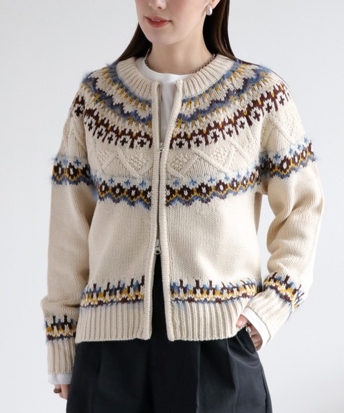 冬の定番!ノルディックな雰囲気の求心柄ジップカーディガン♪◇Point◇求心柄は冬のニットの定番デザイン。目を引くアクセントカラーも混ぜつつ、どこかレトロな雰囲気を持ち合わせたジップカーディガンです。表面はやや起毛させており、フワフワ柔らかな肌触りです。フロントはダブルジップ仕様になっており、インナーの見せ方も自由に変えられます。ベーシックなホワイト&ネイビーの色展開なので、インナーにビビットカラーを合わせるのもトレンドライクでおすすめです◎。◇Material◇アクリル100%の暖かいニット生地。やや厚手の生地なので、秋はアウター代わりに着用できます。ニット特有のチクチク感を軽減しているのでストレスフリーな着心地です。手洗いまたはドライクリーニングでお洗いいただけます。◇Coordinate◇スタイリングの主役になる求心柄ニットは、閉じてプルオーバーとして、開けて羽織として汎用性の高い1着です。求心柄が主役なので、ボトムスはシンプルなアイテムがおすすめ。デニムやワンピース、オーバーオールなどに合わせてナチュラルに、ミリタリーパンツやスラックス合わせで大人カジュアルな雰囲気も◎スカートに合わせた女性らしい着こなしもおすすめです。※照明や天候により実際の色味と異なって見える場合がございます。ご了承くださいませ。【キーワード】#Y2K#10代#20代#30代#40代#50代#ライトアウター#羽織#総柄#ジャガード