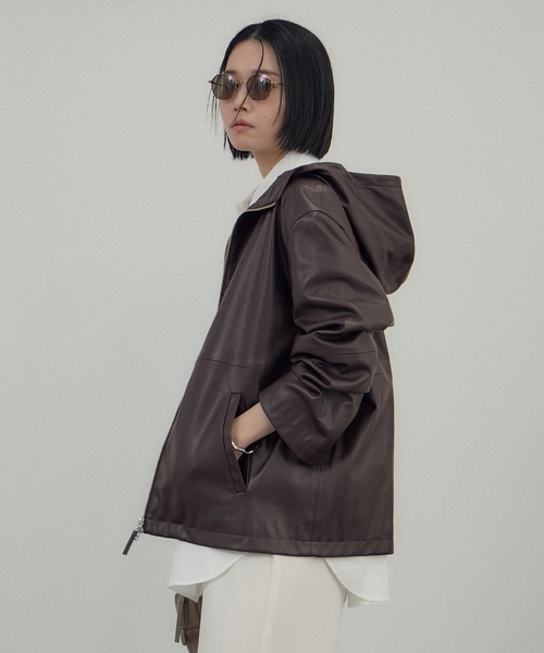 上品なツヤと防風性でアウターとしても活躍。ユニセックスで着られるレザーライクパーカー ■デザイン/シルエット 定番パーカーをレザーライク素材で仕上げた、トレンド感あふれるモードな一枚。 ユニセックスで着用できるビッグシルエットは重ね着がしやすく、抜け感のあるリラックススタイルに。 風を通しにくい素材のため、ライトアウターとしても活躍し、季節の変わり目にも最適な万能デザインです。 ■素材 伸縮性のある合成皮革を使用し、しなやかな質感と上品なツヤを実現。 表面のシボ加工がヴィンテージライクな風合いを加え、カジュアルにもきれいめにも馴染む高見え素材です。 軽さと柔らかさを兼ね備え、長時間着てもストレスを感じにくいのもポイント。 ■コーディネート モヘアニットやシャギーニットなどのカジュアルスタイルと好相性。 スラックスやワンピースなどきれいめコーデの外しとして取り入れると、程よくこなれた大人カジュアルに仕上がります。 ユニセックスで共有できるのも魅力です。 ■モデル身長:165cm 着用サイズ:F ----------------------------- 裏地:なし 光沢感:ややあり 透け感:なし ポケット:あり 伸縮性:なし 生地の厚さ:やや厚手 -----------------------------