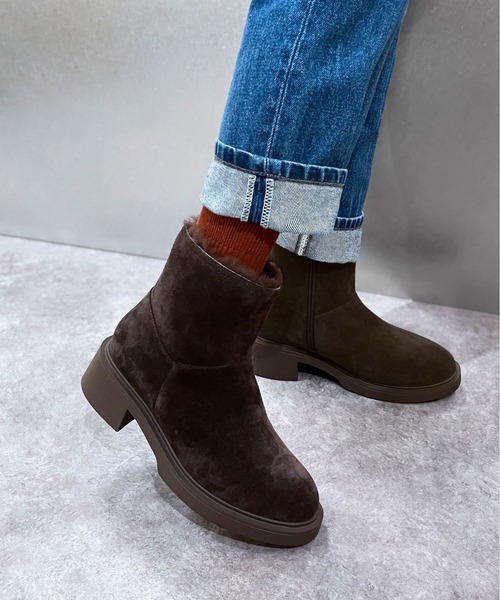 大人きれい見え撥水ムートンショートブーツふわ暖ムートンと撥水カウベロアで、冬のお出かけをもっと快適に。冬の定番であるムートンブーツに、頼れる機能とすっきりとした美シルエットをプラスした大人のための1足。アッパーには撥水加工を施した表情豊かなカウベロアを、ライニングにはふんわりと柔らかな上質ムートンを使用。足を包み込むような優しい肌触りに、思わず癒されます。サイドファスナー付きで着脱しやすく、筒周りのフィット感もアップ。軽量のオリジナルモールドソールはクッション性が高く、カップインソールとの相乗効果でムートンブーツとは思えない歩きやすさを実現。スニーカーのような軽快な履き心地で、長時間のお出かけにもぴったりです。ソール+インソールで約6cmの高さがあり、無理なくスタイルアップできるのも嬉しいポイント。アウトソールには滑りにくいラバー素材を採用し、冬の路面でも安心感をプラスします。カジュアルに寄りすぎないすっきりとしたシルエットで、パンツにもスカートにも合わせやすい万能デザイン。普段のお出かけから旅行まで、さまざまなシーンで活躍してくれる頼れる一足です。【STAFF着用感想】<23.5cm(甲薄め・通常37サイズまたは23.5cm着用)>ムートンがむっちりしているので、最初から少し余裕を持って履きたい方はワンサイズ上げても良いかもしれません。私は、普通の厚みのソックスを履いて37で革が馴染んできたら冬用の厚手のソックスに変更しようかと思っています。※ 完全防水ではございません※画像の商品はサンプルです。お届けする商品に仕様・サイズ等の変更が生じる場合がございます。予めご了承ください。※本革(天然皮革)の商品について素材の特性上、多少のキズやシワ、色ムラや擦れが見られる場合がございます。