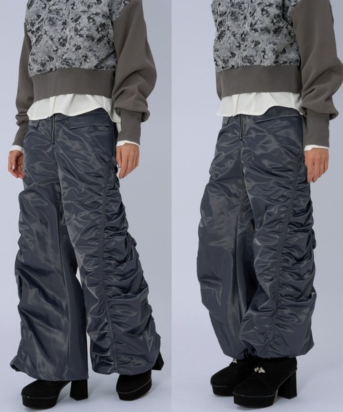 ーーーギャザーと光沢感のある素材がポイントのナイロンデザインパンツーーーpoint□サイドにギャザーを施し、履くだけでポイントになるデザインワイドパンツ□ウエスト部分はジップ仕様で着脱が楽ちん□ウエスト部分は折り返しての着用も〇□裾はドロスト仕様でお好みに合わせてシルエットの変化を楽しめる□上品な光沢感のナイロン生地を使用し、カジュアルすぎずモードな雰囲気に□ウエスト後ろゴムで着心地も快適styling骨格ナチュラル:チュニック丈のニットやスウェットをオンし、ラフなスタイルが◎フラットシューズでもバランスが取りやすく大人っぽく着用できます。骨格ウェーブ:トップスはインして、くびれを強調できるスタイリングがおすすめ。ヒールで脚長効果を狙うとさらにスタイルアップ。骨格ストレート:裾は絞って、ヒール合わせで女性らしく◎トップスはブラウスやミドル丈ジャケットで腰まわりをカバーして綺麗スタイルに。※加工を施した画像を使用しております。実物と色味が異なる可能性があるため、色味は詳細後ろにある生地寄り画像を参考にお願いいたします。あらかじめご了承下さい。