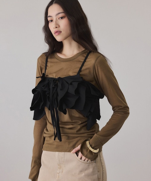 ◇26SS◇ ADAM ET ROPE' FEMME 【Material】 リサイクルポリエステル糸を使用して、土台とフリル部分で編地で変化をつけたニット素材。 ポリエステルならでのはハリとフォルムのある風合いと、マットな艶っとした表面感も特徴。 【Design】 RIB編みパーツにギャザーを寄せてフリルを成形し、ウエーブ状にて土台にミシンで縫い付ける事で立体感を出したニットビスチェ。 フリルが立ち上がりすぎないように所々に留めを入れ、程よく引き立つ立体感を演出。 肩ニット紐は調節可能な仕様。 また、フロントには細ニット紐の仕様となっており、ジャケットなどの上にも着用できるよう、サイズアジャスト機能を採用。 重ねるだけで華やかさを演出できるアイテム。 【Color】 ブラックの1色展開 【Styling Point】 ジャケットの上に重ねてカジュアルダウン&華やぎUPなスタイリングなど。 タイトなトップス、ニットなどに重ねても素敵。 --------------- 透け感:なし 裏地:なし 伸縮性:ややあり 光沢感:なし 生地の厚さ:中肉 開き方:細ニット紐 --------------- ◇モデル情報 身長:165cm size:F ※撮影時の光、お使いのモニター環境によって色の見え方が違う場合がございます。