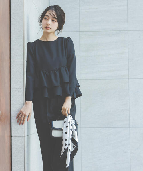 キレイなシルエットが特徴の大人フェミニンなぺプラムブラウス。ウエスト位置を高く切り替えた、華やかな2段のペプラムシルエットです。後ろウエストはゴムが入っているので動きやすさと着心地の良さを叶えてくれます。袖先はスリット入りで手元に抜け感をプラス。同素材の美脚パンツとのセットアップもお勧めです。<素材>微ストレッチの効いたキレイめ素材を使用しています。<詳細>仕様・後ろボタン裏地・なし透け感・なし / 光沢・なし / 伸縮性・ややあり生地の厚さ・普通<シリーズ>■パンツ[品番:1216130101] ※モデルの着用画像の場合、光の当たり具合により、実際の色味と異なって見えることがございます。色味は、商品単体の画像をご参照ください。<商品のお気に入り登録>お気に入りアイテムの値下げ・再入荷・在庫1点などの通知を受け取ることができる便利機能ですので気に入ったアイテムはお気に入り登録がおすすめ!<ショップのお気に入り登録>新商品や再入荷、セール、クーポン配布などお得な情報を受け取ることができます。●撮影はサンプル商品で行っている為、仕様とサイズが異なる場合がございます。●スタジオ及び屋外で撮影した着用画像は、光の当たり具合で色味が違って見える場合があります。予めご了承ください。