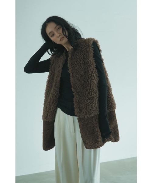 触れた瞬間に、やわらかな空気を抱きしめたような温もりを感じるボア切替のベスト。上部は毛足の長いふわりとしたボア、下部は密に詰まった短めのボア。見た目のボリュームに反して驚くほど軽く肩にのせると身体のラインに沿うやさしいフィット感。厚手のニットを重ねてもごわつきにくいゆとりのあるアームホールが設計されています。ヒップ下の安心感のある丈。切替位置が低めに入っているため視線が下へ自然に流れ、重さを感じさせず全体のバランスをすっきりと見せてくれます。ノーカラーのシンプルなデザインは、タートル、フーディ、シャツ、ワンピース…どんな首元とも調和し、日々のスタイリングにそっと深みを添える存在。フロントは開けたままでも閉じても形が崩れずその日の気分や空気に合わせて軽やかに着こなしを変えられます。フックタイプの金具が付いていて前を閉じることもOK。写真では伝えきれないくらい指先で触れるとふわっとほどけるような柔らかさ。[着用時期]9〜3月(約18℃以下)[透け感]なし[生地の厚み]中肉[ストレッチ]なし[生地のやわらかさ]やわらかい[生地の特徴]優しい肌あたりのファーと密度の詰まった毛足の短いボア素材[落ち感]なし[着用ジワ]なりにくい[ポケット]有[身長]全ての方に(身長によって着丈が変わります)※感じ方には個人差がございますので気になる部分がありましたらお気軽にお問い合わせください
