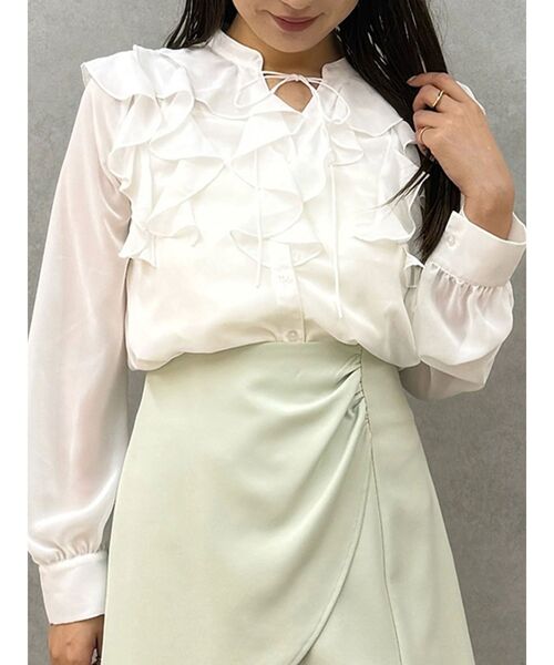 トレンドのラッフルデティールで華やかなブラウスです。襟元のリボンがアクセントになっています。透け感のあるシフォンを使い、軽やかな仕上がりになっています。インナーキャミソール付きです。 ▼スタイリング シンプルなマーメイドスカートやデニムパンツと合わせるとラッフルとのバランスが良くおすすめです。 ~~ZOZOTOWNでお買い物を楽しむ便利機能~~♡商品のお気に入り登録完売カラーの再入荷時、ラスト1点の時、セール開始時に通知でお知らせします。予約アイテムが入荷して通常販売になった時もお知らせしてくれます!♡ブランドのお気に入り登録新商品や再入荷、セールやクーポン情報など、ブランドのお得な情報をいち早く受け取ることができます!※実際にお届けする商品と仕様やサイズが異なる場合がございます。また、生産の都合上、お届け時期が前後する場合がございます。※写真はすべてサンプルです。 ※ボタンはボディ同色になります。 ※フリルを抑えているステッチが無くなるのでより軽やかな雰囲気になります。 ※前身頃のフリルは内側の方が長くなります。 ※袖山にギャザーが入ります。